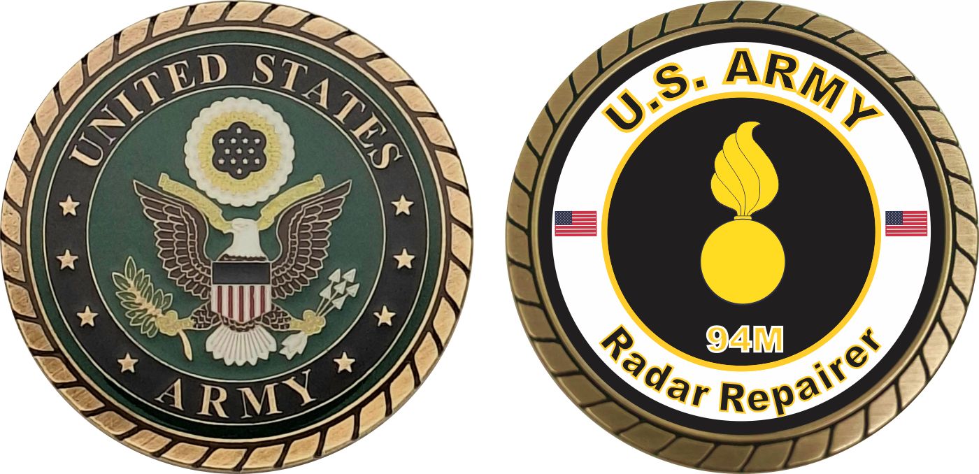 This 1 3/4” U.S. Army MOS 94M Radar Repairer Challenge Coin is proudly offered by Militarybest. This Officially Licensed Army MOS coin has beautiful enamel finish on one side and an organized crisp clean 94M Radar Repairer designation on the opposite side.