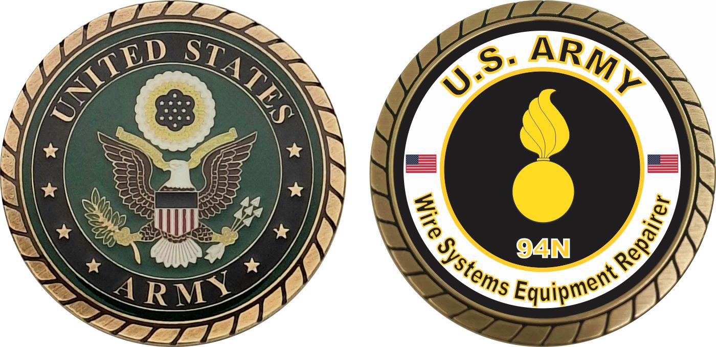 This 1 3/4” U.S. Army MOS 94N Wire Systems Equipment Repairer Challenge Coin is proudly offered by Militarybest. This Officially Licensed Army MOS coin has beautiful enamel finish on one side and an organized crisp clean 94N Wire Systems Equipment Repairer designation on the opposite side.