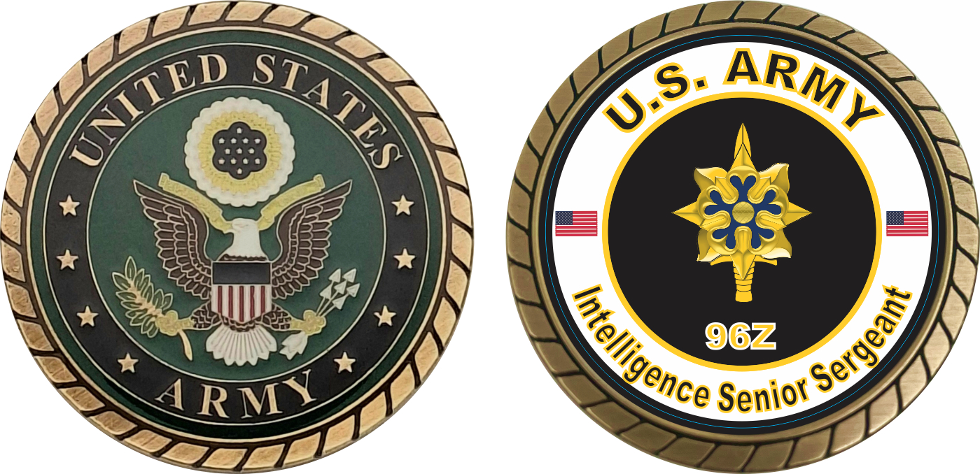 This 1 3/4” U.S. Army MOS 96Z Intelligence Senior Sergeant Challenge Coin is proudly offered by Militarybest. This Officially Licensed Army MOS coin has beautiful enamel finish on one side and an organized crisp clean 96Z Intelligence Senior Sergeant designation on the opposite side.
