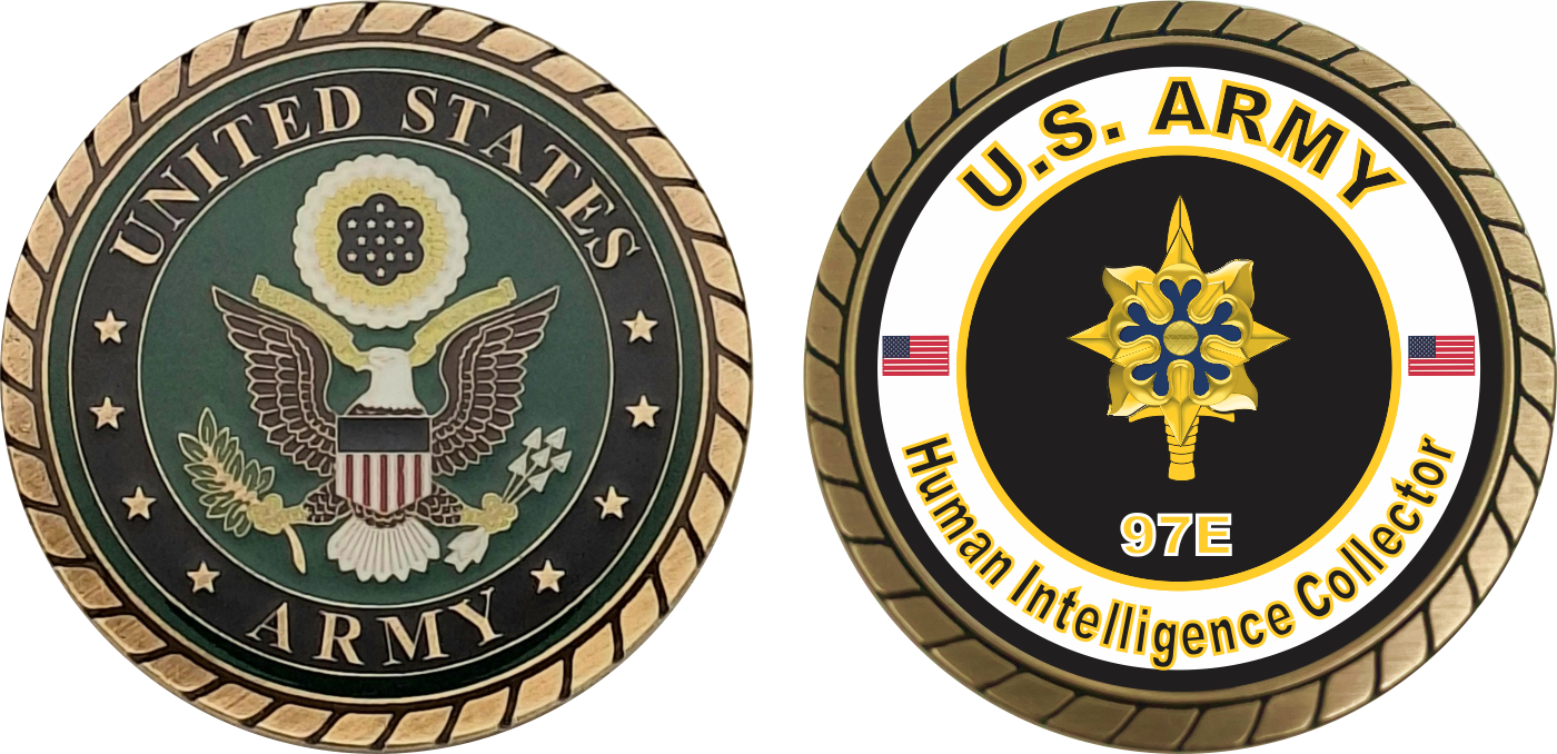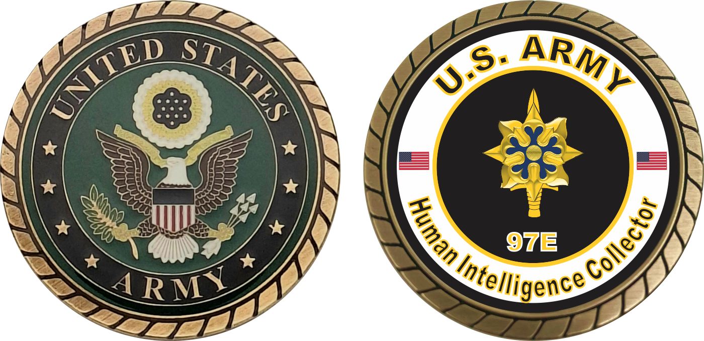 This 1 3/4” U.S. Army MOS 97E Human Intelligence Collector Challenge Coin is proudly offered by Militarybest. This Officially Licensed Army MOS coin has beautiful enamel finish on one side and an organized crisp clean 97E Human Intelligence Collector designation on the opposite side.