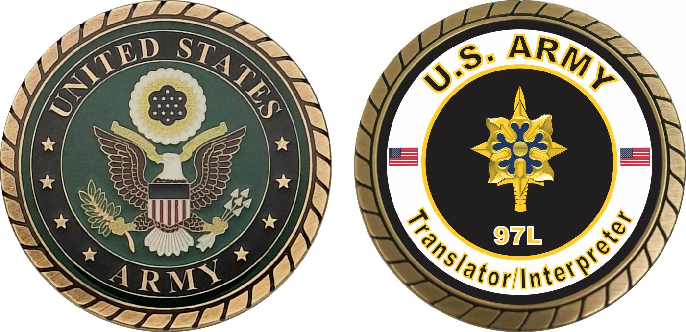 This 1 3/4” U.S. Army MOS 97L Translator/Interpreter Challenge Coin is proudly offered by Militarybest. This Officially Licensed Army MOS coin has beautiful enamel finish on one side and an organized crisp clean 97L Translator/Interpreter designation on the opposite side.