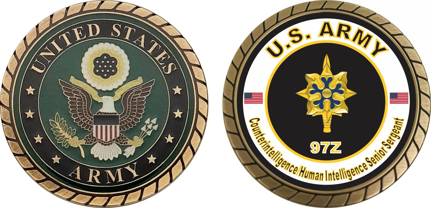 This 1 3/4” U.S. Army MOS 97Z Counterintelligence/Human Intelligence Senior Sergeant Challenge Coin is proudly offered by Militarybest. This Officially Licensed Army MOS coin has beautiful enamel finish on one side and an organized crisp clean 97Z Counterintelligence/Human Intelligence Senior Sergeant designation on the opposite side.