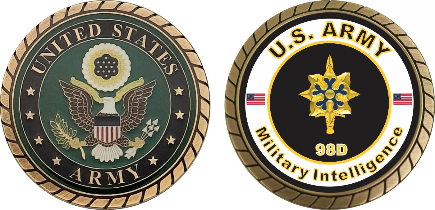 This 1 3/4” U.S. Army MOS 98D Military Intelligence Challenge Coin is proudly offered by Militarybest. This Officially Licensed Army MOS coin has beautiful enamel finish on one side and an organized crisp clean 98D Military Intelligence designation on the opposite side.