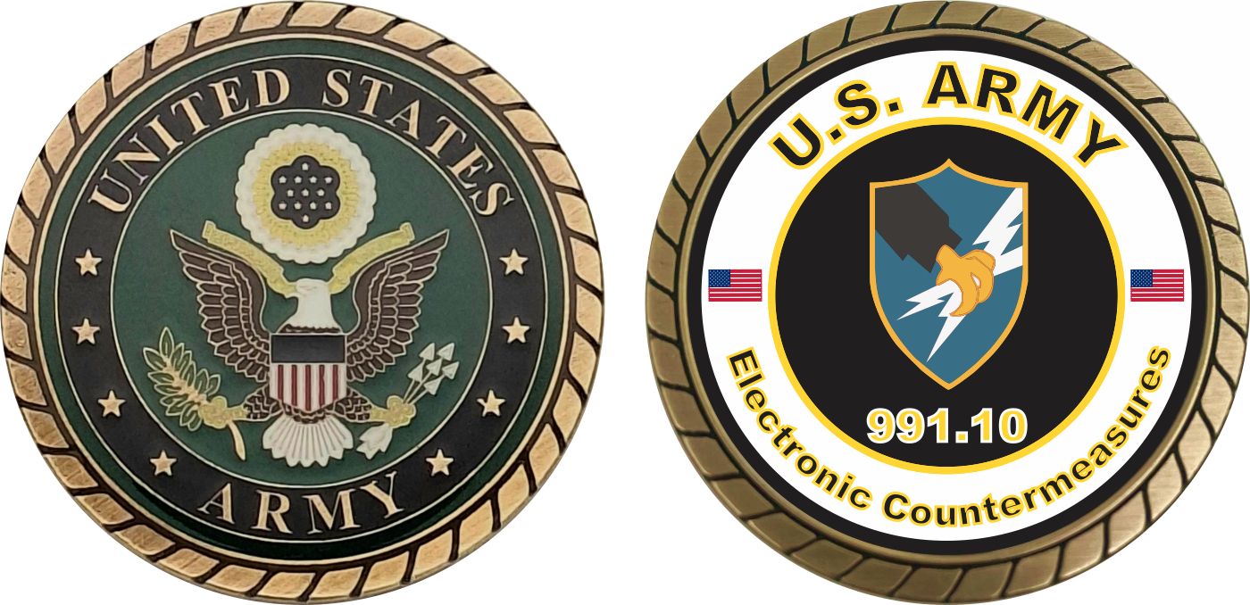 This 1 3/4” U.S. Army MOS 991 Electronic Countermeasures Challenge Coin is proudly offered by Militarybest. This Officially Licensed Army MOS coin has beautiful enamel finish on one side and an organized crisp clean 991 Electronic Countermeasures designation on the opposite side.