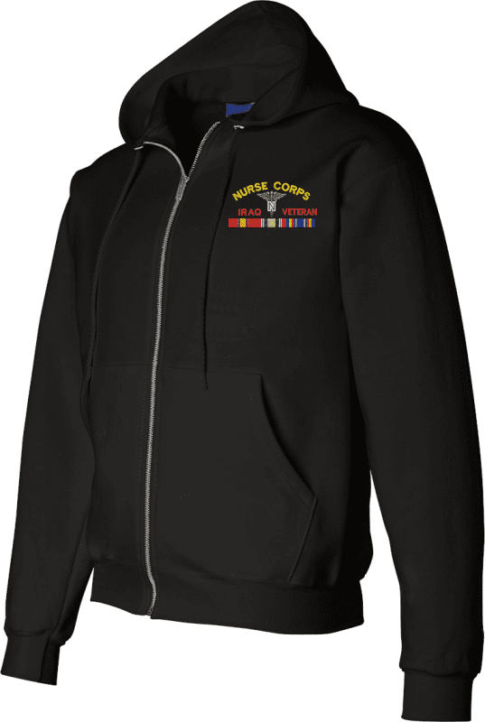 MilitaryBest has expanded its line of apparel with this custom embroidered U.S. Army Nurse Corps Iraq Veteran Zippered Hoodie. Each Hoodie is direct embroidered onto a Champion brand 9.5 oz 50/50 Cotton Poly blend. This will make an excellent addition to your wardrobe, or a great gift. Your satisfaction is Guaranteed! These quality zippered hoodies are proudly embroidered at our facilities in Scottsboro, AL. Support the Army MWR program by purchasing only from Licensed Vendors.