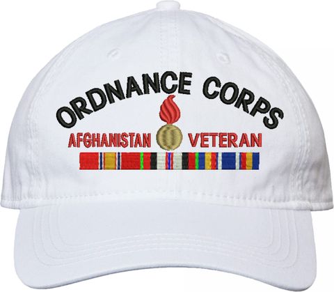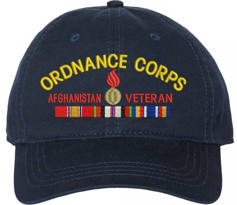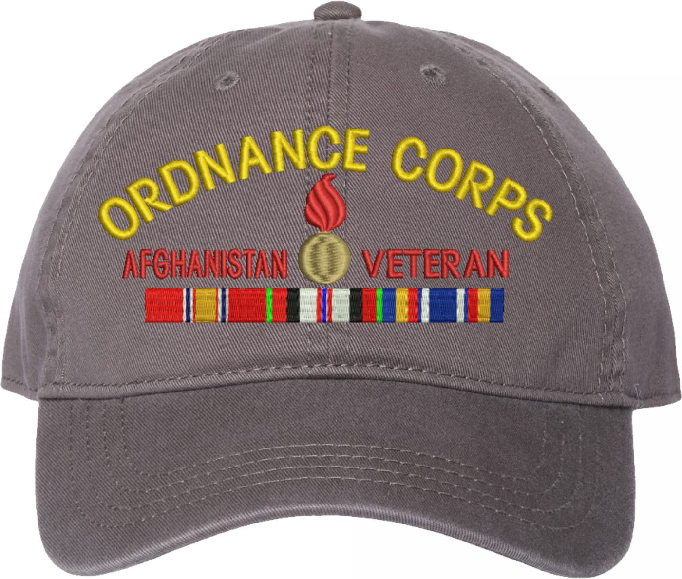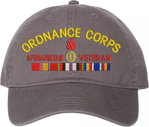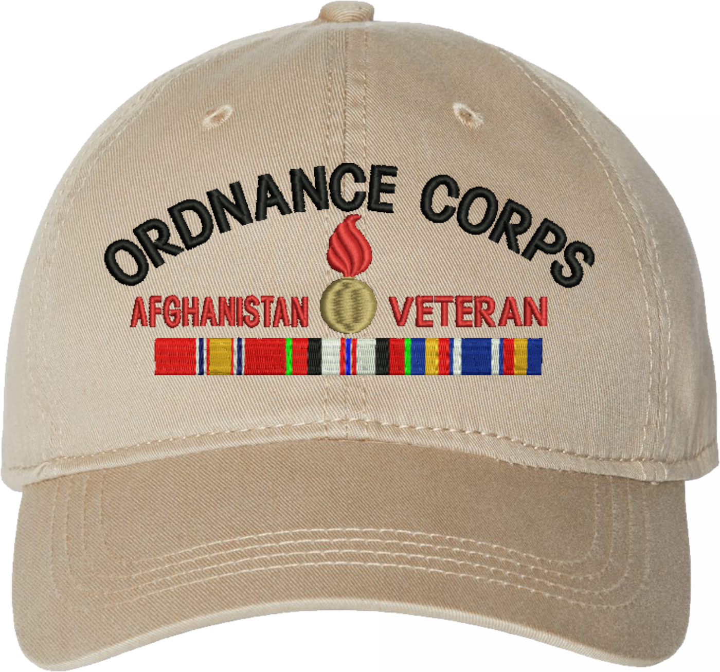 Show your Army pride with this U.S. Army Ordnance Corps Afghanistan Veteran Unstructured Dad Cap from MilitaryBest. Crafted from 100% washed chino twill cotton, this six-panel, low-profile cap offers a relaxed and comfortable fit. Featuring high-quality embroidery done in our Scottsboro, Alabama facility, this cap is designed with a pre-curved visor and an adjustable tri-glide buckle closure for a perfect fit. Whether for everyday wear or as a meaningful gift, this cap is a great way to honor your own or a loved one's service.For caps ordered with custom embroidered personalized text please allow an additional 3 to 5 days production time. All custom back text will be embroidered in ALL CAPITAL LETTERS. Caps with back text or eggs are non-returnable unless there is a material defect in the cap.