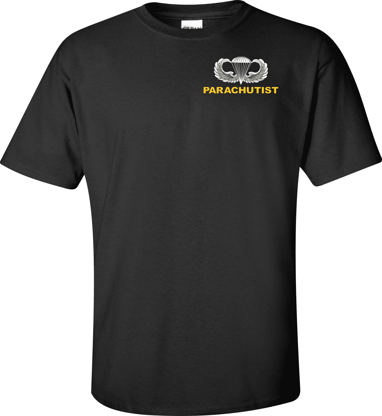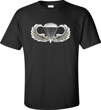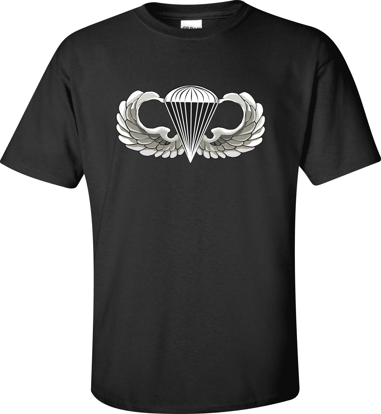 MilitaryBest is proud to offer this fine U.S. Army Parachutist Badge 'Jump Wings' T-shirt. This shirt is available with several options for the image on the front of the shirt, as well as, offering a full-sized Insignia on the back. Each U.S. Army Parachutist Badge 'Jump Wings' T-shirt is proudly printed in the USA.Unless there is a defect in workmanship or material, these shirts are unreturnable.