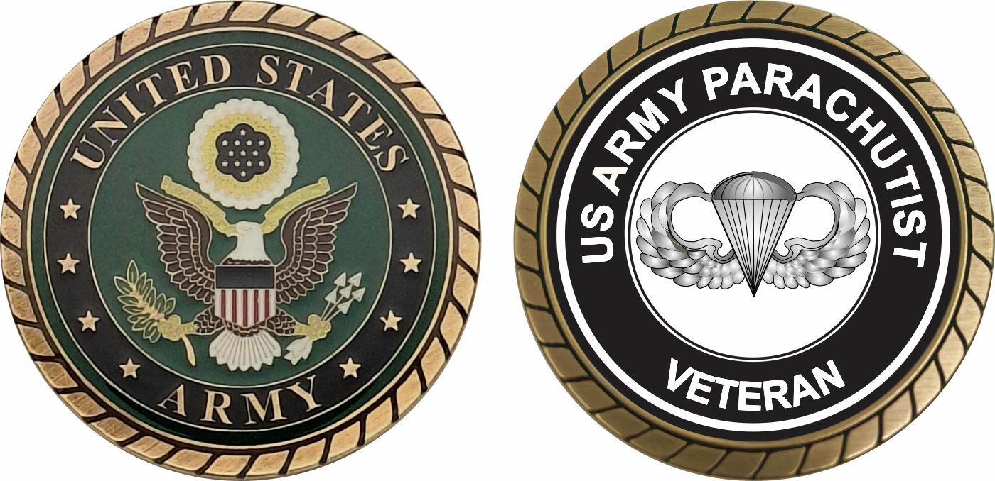 This 1 3/4” U.S. Army Parachutist Veteran Challenge Coin is proudly offered by MilitaryBest. This Officially Licensed Army coin has beautiful enamel finish on one side and an organized crisp clean U.S. Army Parachutist Veteran design on the opposite side.