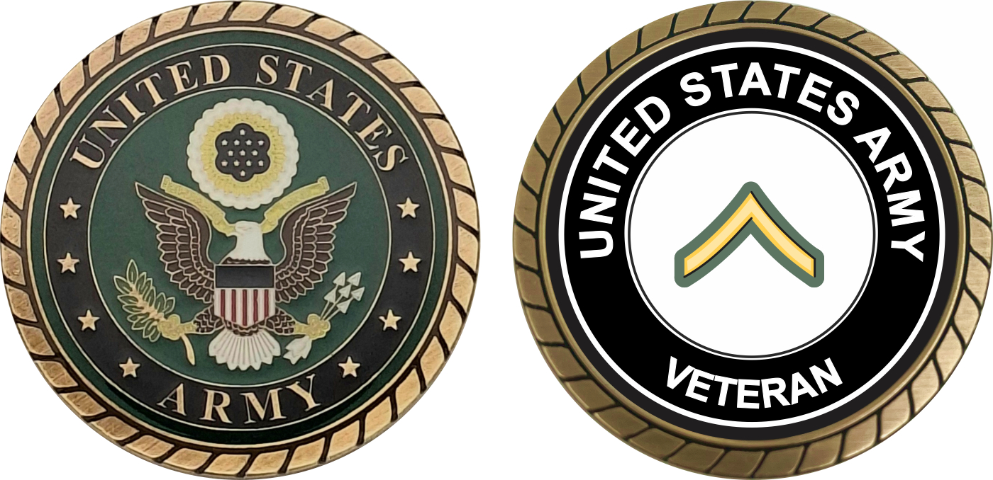This 1 3/4” U.S. Army Private Veteran Challenge Coin is proudly offered by MilitaryBest. This Officially Licensed Army coin has beautiful enamel finish on one side and an organized crisp clean U.S. Army Private Veteran design on the opposite side.