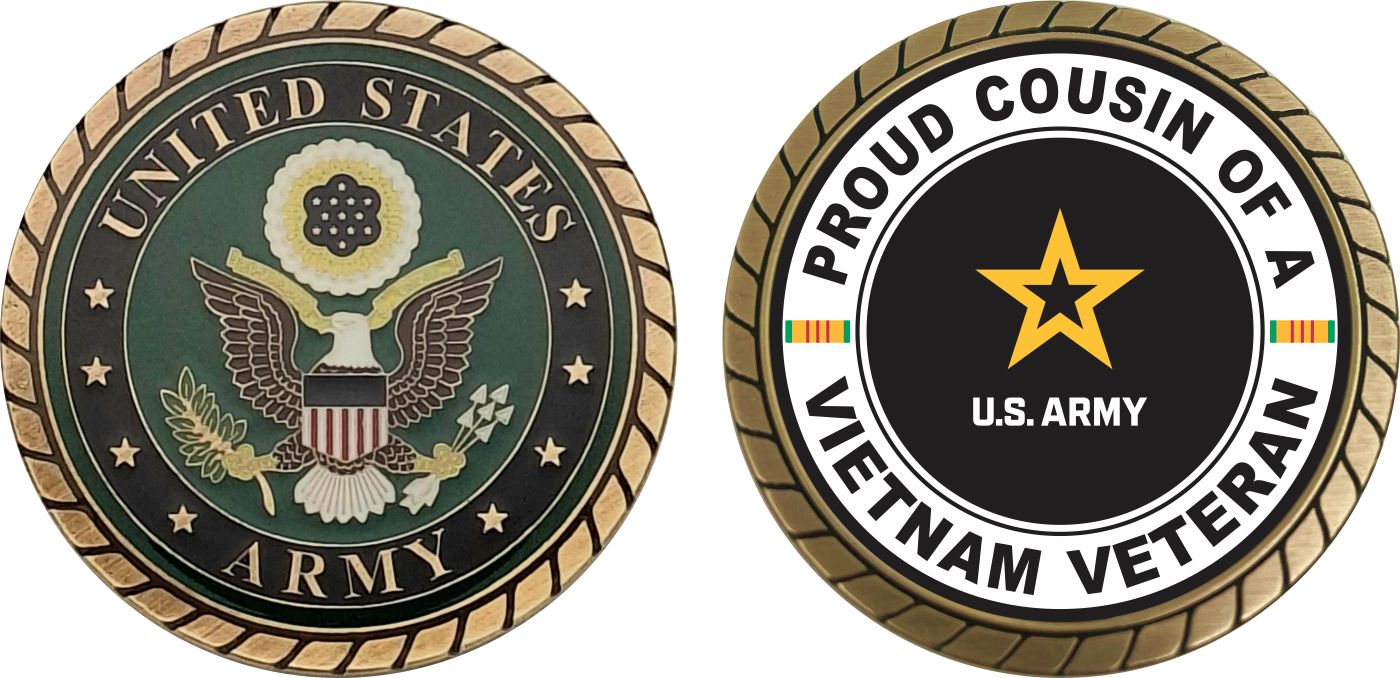 This 1 3/4” U.S. Army Proud Cousin of a Vietnam Veteran Challenge Coin is proudly offered by MilitaryBest. This Officially Licensed Army coin has beautiful enamel finish on one side and an organized crisp clean U.S. Army Proud Cousin of a Vietnam Veteran design on the opposite side.