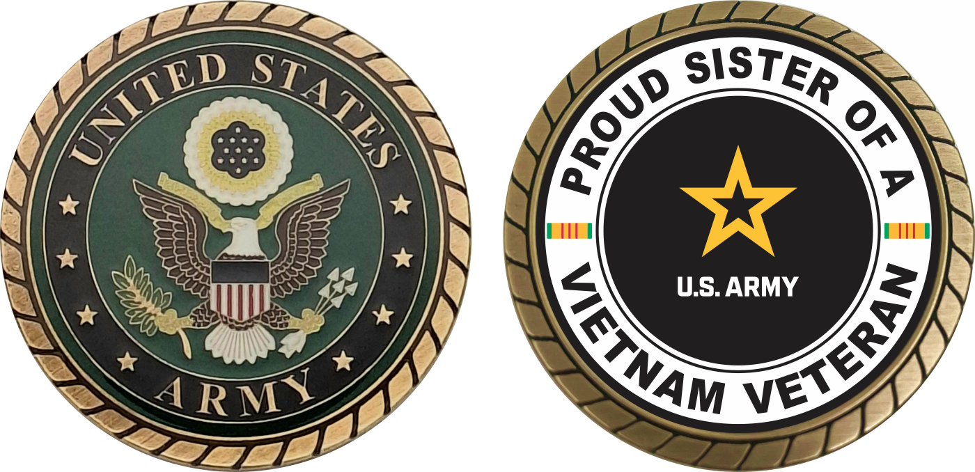 This 1 3/4” U.S. Army Proud Sister of a Vietnam Veteran Challenge Coin is proudly offered by MilitaryBest. This Officially Licensed Army coin has beautiful enamel finish on one side and an organized crisp clean U.S. Army Proud Sister of a Vietnam Veteran design on the opposite side.