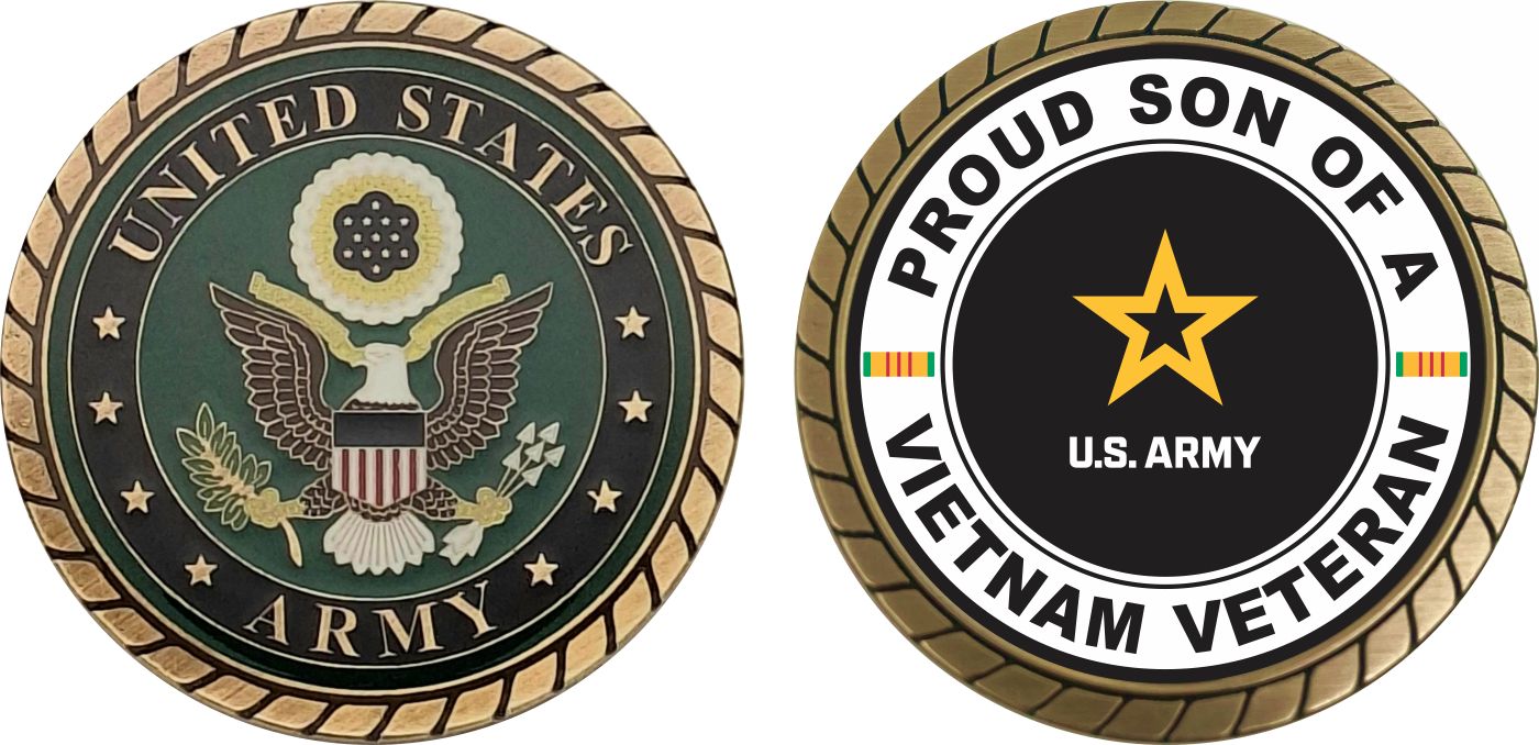 This 1 3/4” U.S. Army Proud Son of a Vietnam Veteran Challenge Coin is proudly offered by MilitaryBest. This Officially Licensed Army coin has beautiful enamel finish on one side and an organized crisp clean U.S. Army Proud Son of a Vietnam Veteran design on the opposite side.