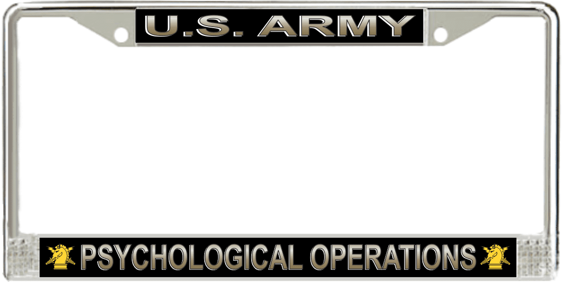 This U.S. Army Psychological Operations License Plate Frame is made from the highest quality finished metal alloy. Each one is designed to provide years of use. Each is designed and produced in our facility in Scottsboro, Alabama. Our Military License Plate Frames are standard designs and have been a staple in our product line for 15 years. Please check with your state and local regulations regarding suitability for displaying this License Plate Frame on you vehicle since these regulations may have changed over time.A percentage of the sale of each MilitaryBest item is forwarded to the licensing departments of each respective branch of service in support of the MWR (Morale, Welfare, & Recreation) program. These payments are made by either ALL4U LLC or the wholesaler from where the item originated. Our team thanks you for your service and your support of these programs.