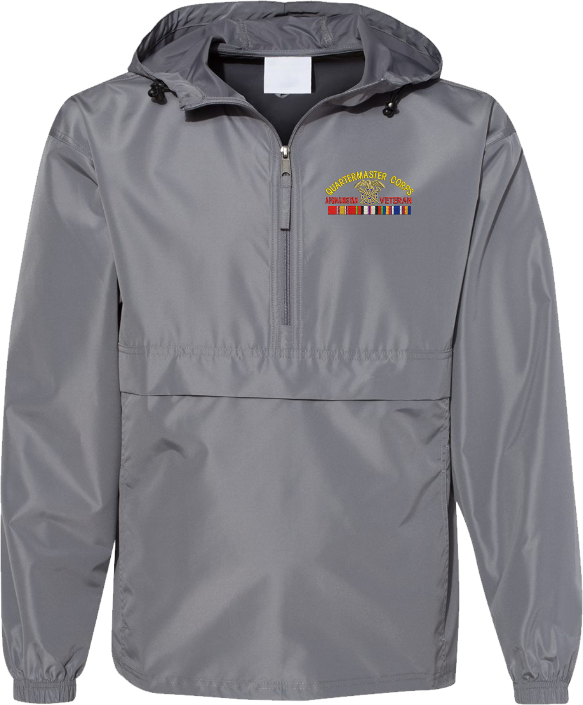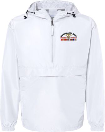 MilitaryBest is proud to offer this quality U.S. Army Quartermaster Corps Afghanistan Veteran Hooded Windbreaker. Also known as an Anorak Jacket, this windbreaker is designed to keep wind and water out. With a design embroidered over the left chest, this windbreaker is embroidered to order at our facilities in Scottsboro, AL.. This windbreaker can be packed into the mesh lined pouch pocket for a more portable method of storage.- 100% Polyester