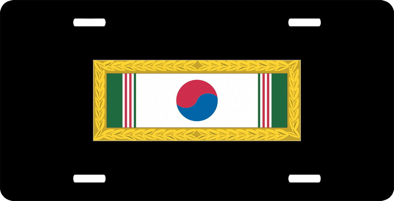 This U.S. Army Republic Of Korea Presidential Unit Citation Ribbon License Plate is made from heavy gauge aluminum and has a baked enamel finish to last for many years of use. Each plate measures 5 15/16" x 11 15/16". This license plate would make a wonderful addition to your collection or a great gift.