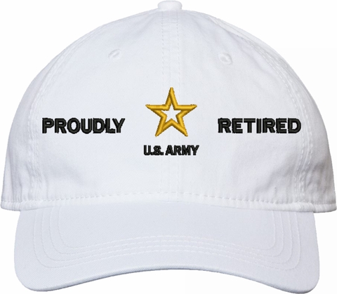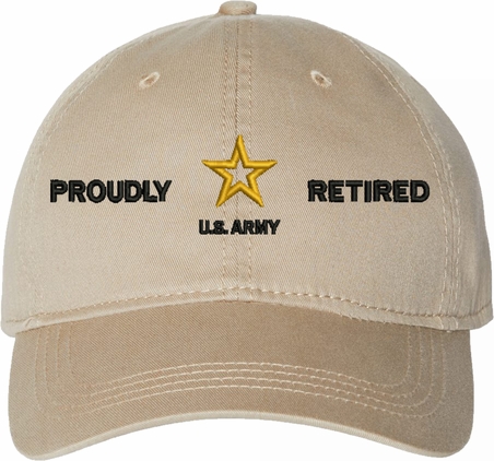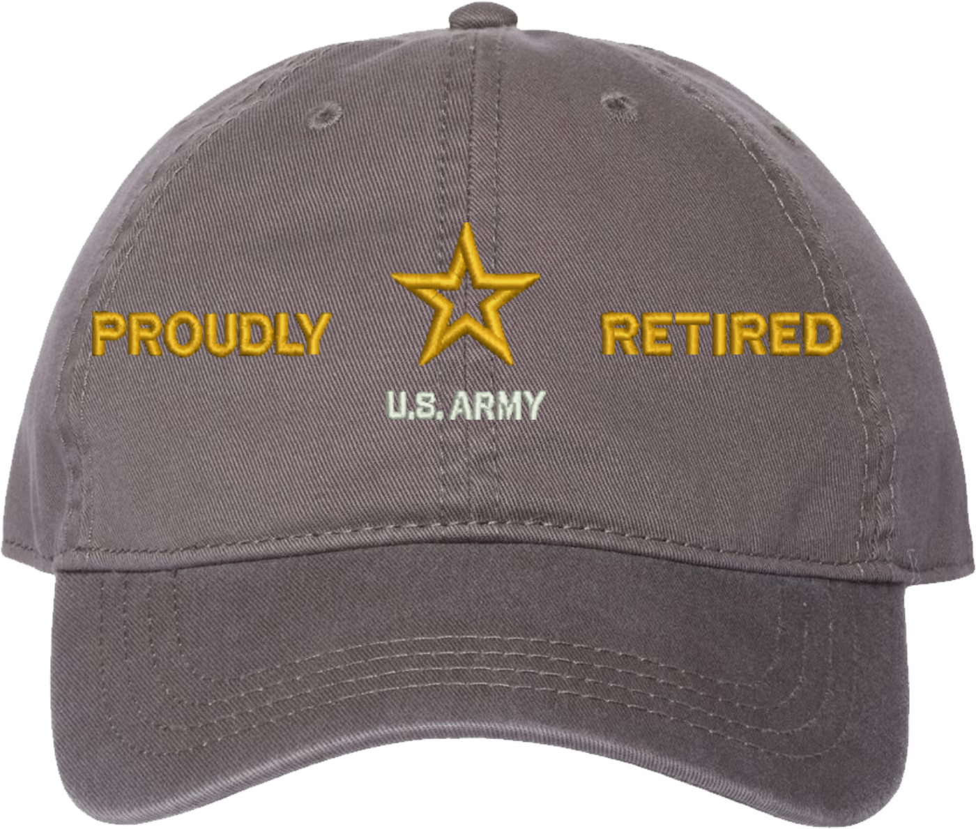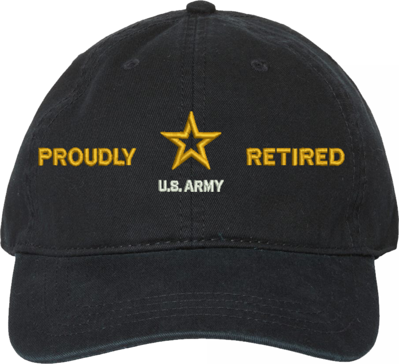 Show your Army pride with this U.S. Army Proudly Retired Unstructured Dad Cap from MilitaryBest. Crafted from 100% washed chino twill cotton, this six-panel, low-profile cap offers a relaxed and comfortable fit. Featuring high-quality embroidery done in our Scottsboro, Alabama facility, this cap is designed with a pre-curved visor and an adjustable tri-glide buckle closure for a perfect fit. Whether for everyday wear or as a meaningful gift, this cap is a great way to honor your own or a loved one's service.For caps ordered with custom embroidered personalized text please allow an additional 3 to 5 days production time. All custom back text will be embroidered in ALL CAPITAL LETTERS. Caps with back text or eggs are non-returnable unless there is a material defect in the cap.
