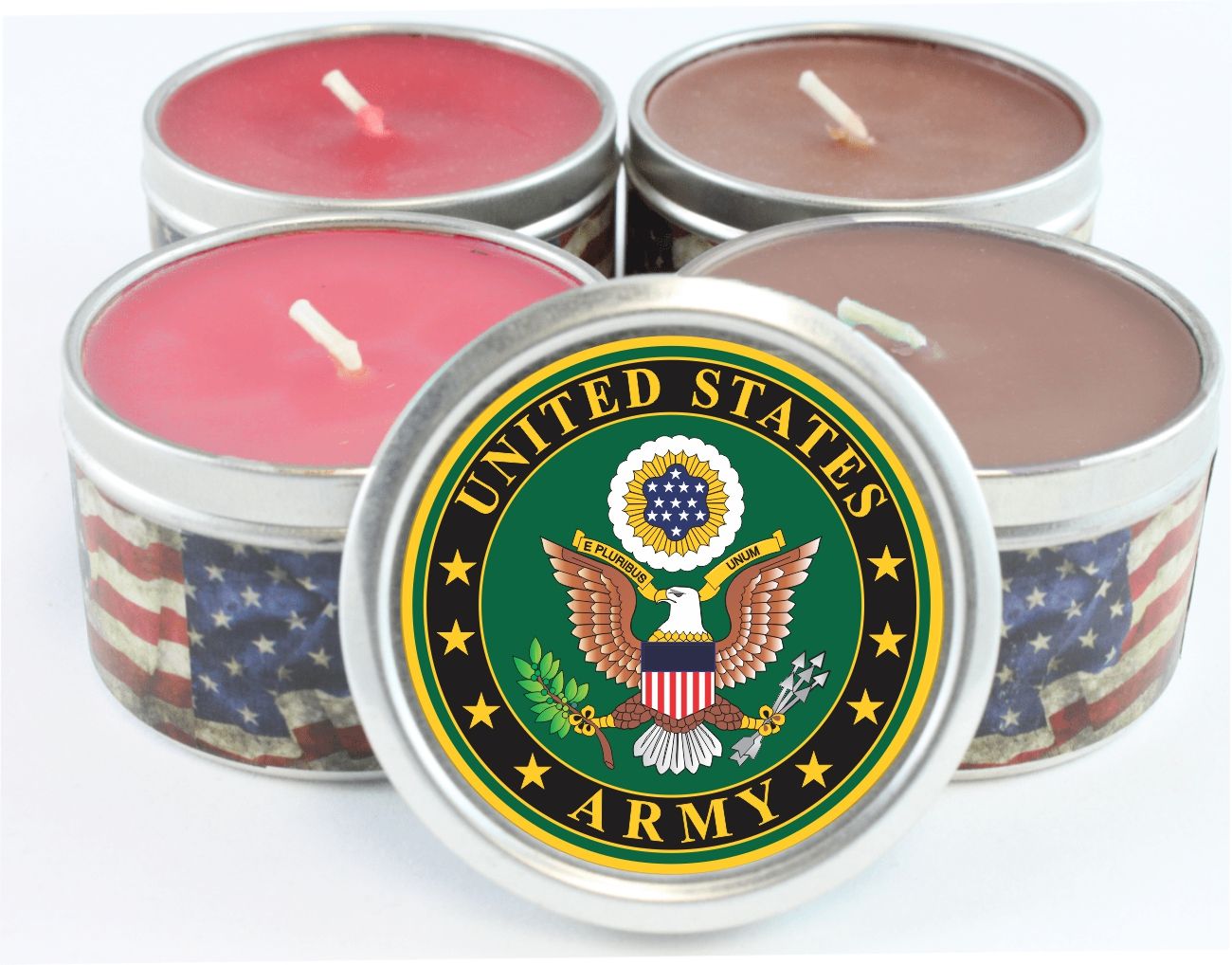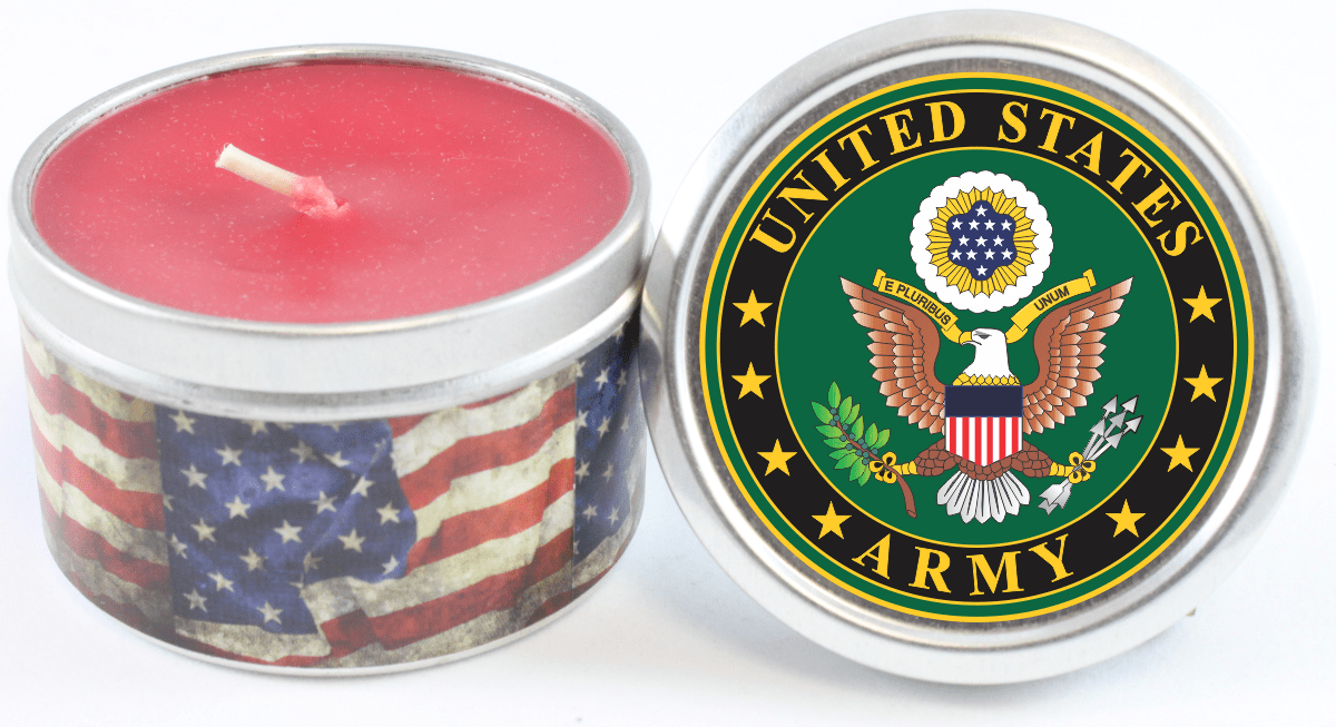 MilitaryBest is proud to offer this selection of U.S. Army Emblem Scented Candles. Each candle features an American flag banner wrapped around the base with the U.S. Army emblem on the lid. These candles are manufactured with a custom mix of blended scents and paraffin wax of maximum purity and utilize zinc-cored wicks for cool, extended burning. The 4 Ounce candles have a burn time of 22-26 hours and the 8 Ounce candles have a burn time of 48 hours. These U.S. Army Emblem Scented Candles are made in the USA and their quality is guaranteed!