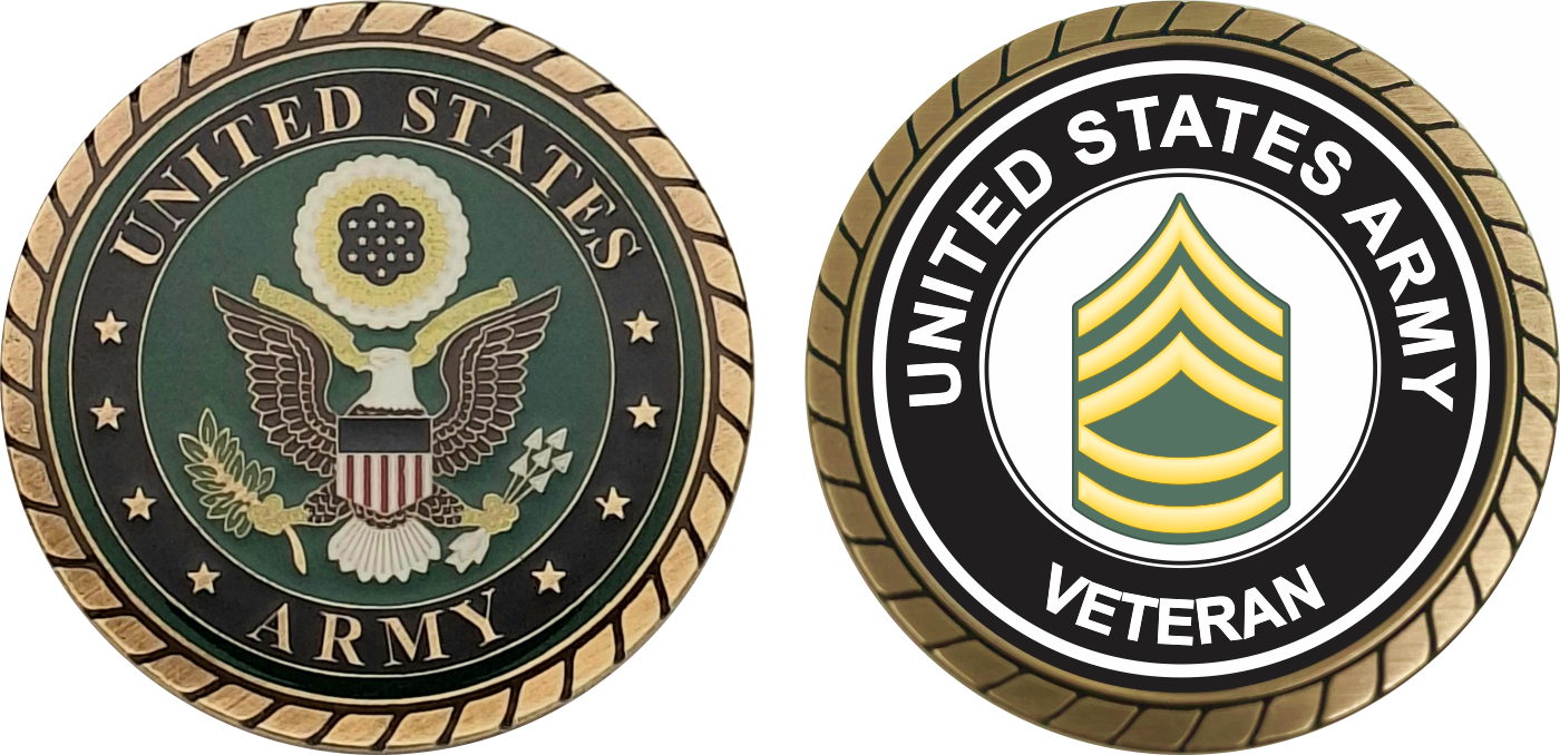 This 1 3/4” U.S. Army Sergeant First Class Veteran Challenge Coin is proudly offered by MilitaryBest. This Officially Licensed Army coin has beautiful enamel finish on one side and an organized crisp clean U.S. Army Sergeant First Class Veteran design on the opposite side.
