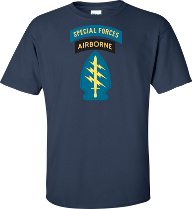 MilitaryBest is proud to offer this fine U.S. Army Special Forces Airborne Insignia and Tab T-shirt. This shirt is available with several options for the image on the front of the shirt, as well as, offering a full-sized Insignia on the back. Each U.S. Army Special Forces Airborne Insignia and Tab T-shirt is proudly printed in the USA.Unless there is a defect in workmanship or material, these shirts are unreturnable.