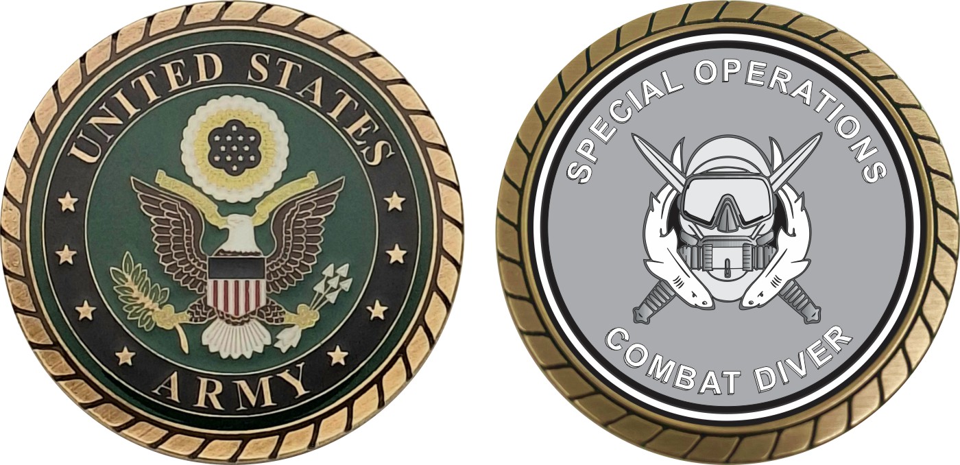 This 1 3/4” U.S. Army Special Forces Combat Diver 2 Challenge Coin is proudly offered by Militarybest. This Officially Licensed Army coin has beautiful enamel finish on one side and an organized crisp clean design on the opposite side.
