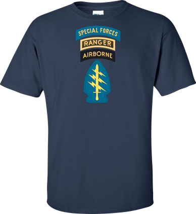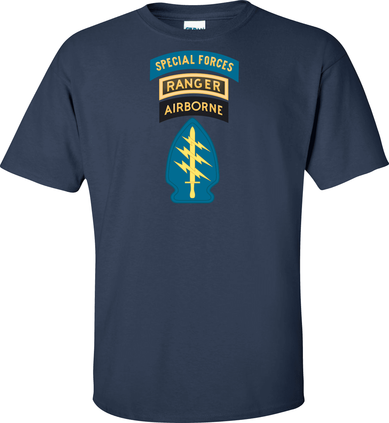 MilitaryBest is proud to offer this fine U.S. Army Special Forces with Airborne and Ranger Tab T-shirt. This shirt is available with several options for the image on the front of the shirt, as well as, offering a full-sized Insignia on the back. Each U.S. Army Special Forces with Airborne and Ranger Tab T-shirt is proudly printed in the USA.Unless there is a defect in workmanship or material, these shirts are unreturnable.