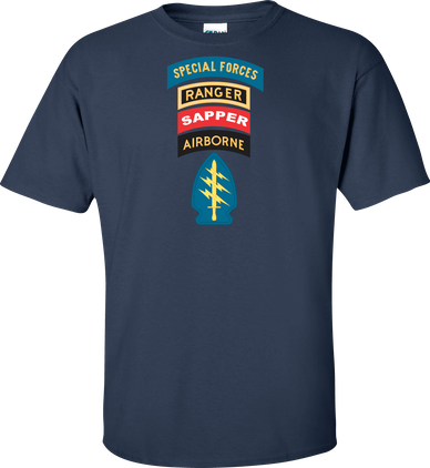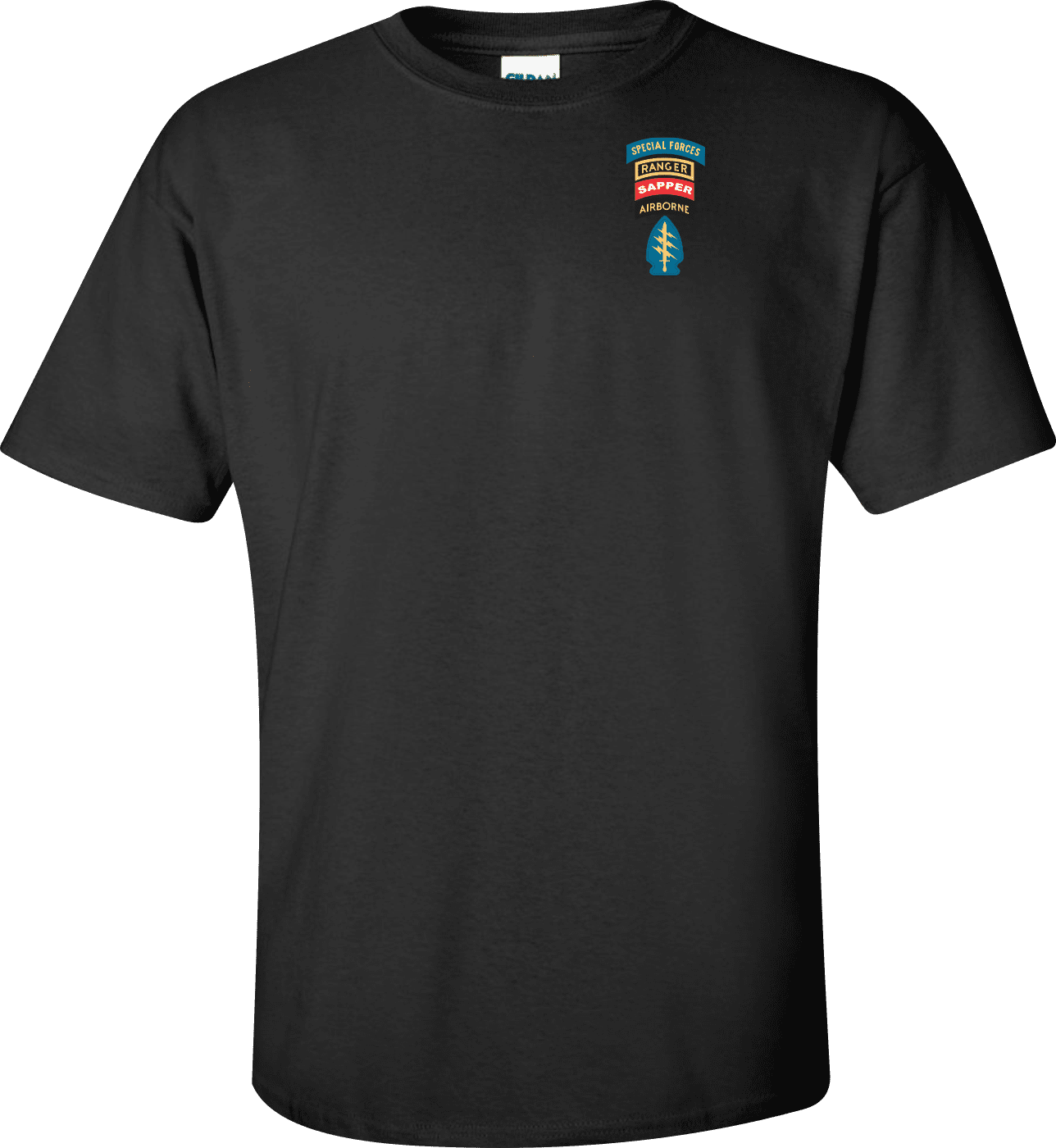 MilitaryBest is proud to offer this fine U.S. Army Special Forces with Ranger Sapper and Airborn Tabs T-shirt. This shirt is available with several options for the image on the front of the shirt, as well as, offering a full-sized Insignia on the back. Each U.S. Army Special Forces with Ranger Sapper and Airborn Tabs T-shirt is proudly printed in the USA.Unless there is a defect in workmanship or material, these shirts are unreturnable.