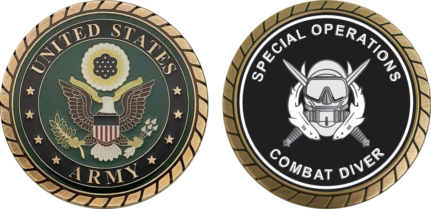 This 1 3/4” U.S. Army Special Operations Combat Diver Challenge Coin is proudly offered by Militarybest. This Officially Licensed Army coin has beautiful enamel finish on one side and an organized crisp clean design on the opposite side.