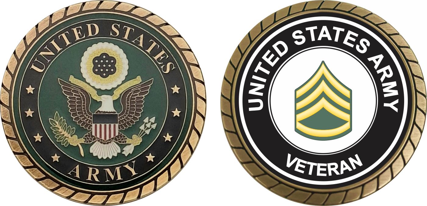 This 1 3/4” U.S. Army Staff Sergeant Veteran Challenge Coin is proudly offered by MilitaryBest. This Officially Licensed Army coin has beautiful enamel finish on one side and an organized crisp clean U.S. Army Staff Sergeant Veteran design on the opposite side.