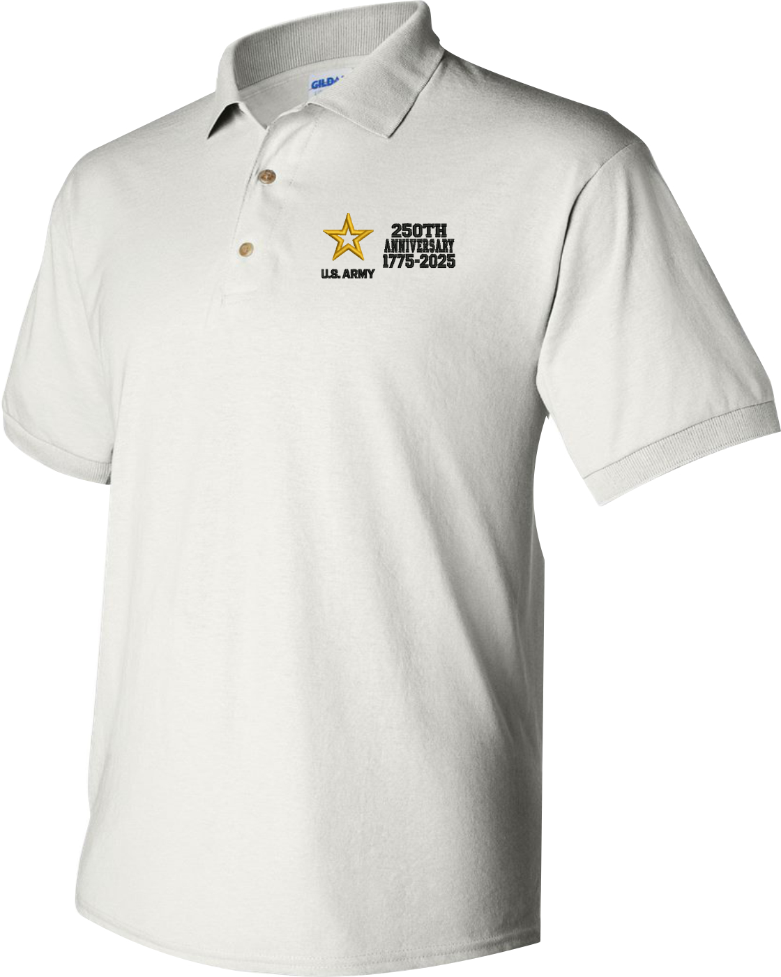 MilitaryBest is proud to offer this quality U.S. Army Star Insignia 250th Anniversary Split Design Embroidered Polo. Each Polo is available in either 100% Ringspun cotton pique or a 50/50 cotton/polyester blend. These quality Military Polos are proudly embroidered at our facilities in Scottsboro, AL. Support the Army MWR program by purchasing only from Licensed Vendors.