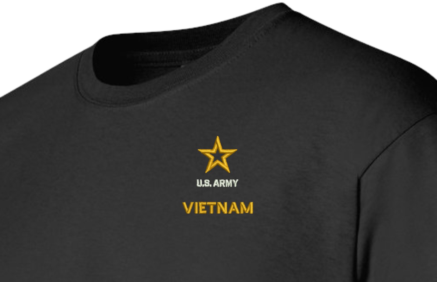 Note: Some of the Color Options pictured may not be available. Available Color Options are listed on the drop down menu above.MilitaryBest is expanding its line of apparel with this fine U.S. Army Vietnam T-Shirt. This Gildan brand short sleeve t-shirt is made using a 6 oz pre-shrunk 100% cotton material. This U.S. Army Vietnam T-Shirt will make an excellent addition to your wardrobe or a fine gift. This U.S. Army Vietnam T-Shirt is custom embroidered at our facilities in Scottsboro, AL when you place your order.