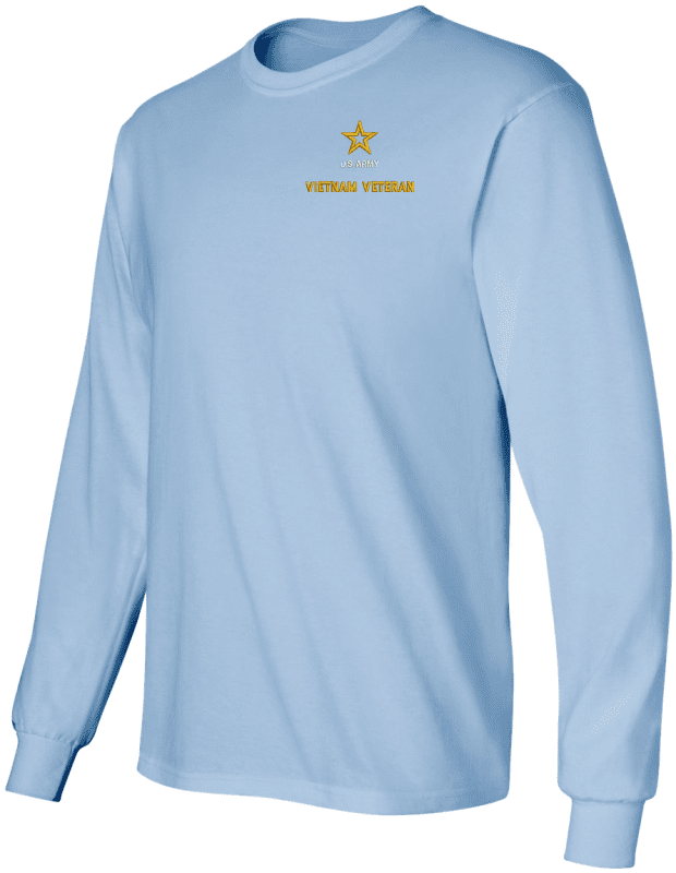 Note: Some of the Color Options pictured may not be available. Available Color Options are listed on the drop down menu above.MilitaryBest has expanded its line of apparel with this custom embroidered U.S. Army Vietnam Veteran Long Sleeve T-Shirt. This Gildan brand long sleeve t-shirt is made using a 6 oz pre-shrunk 100% cotton material. This U.S. Army Vietnam Veteran Long Sleeve T-Shirt will make an excellent addition to your wardrobe or a quality gift. This U.S. Army Vietnam Veteran Long Sleeve T-Shirt is custom embroidered at our facilities in Scottsboro, Alabama.