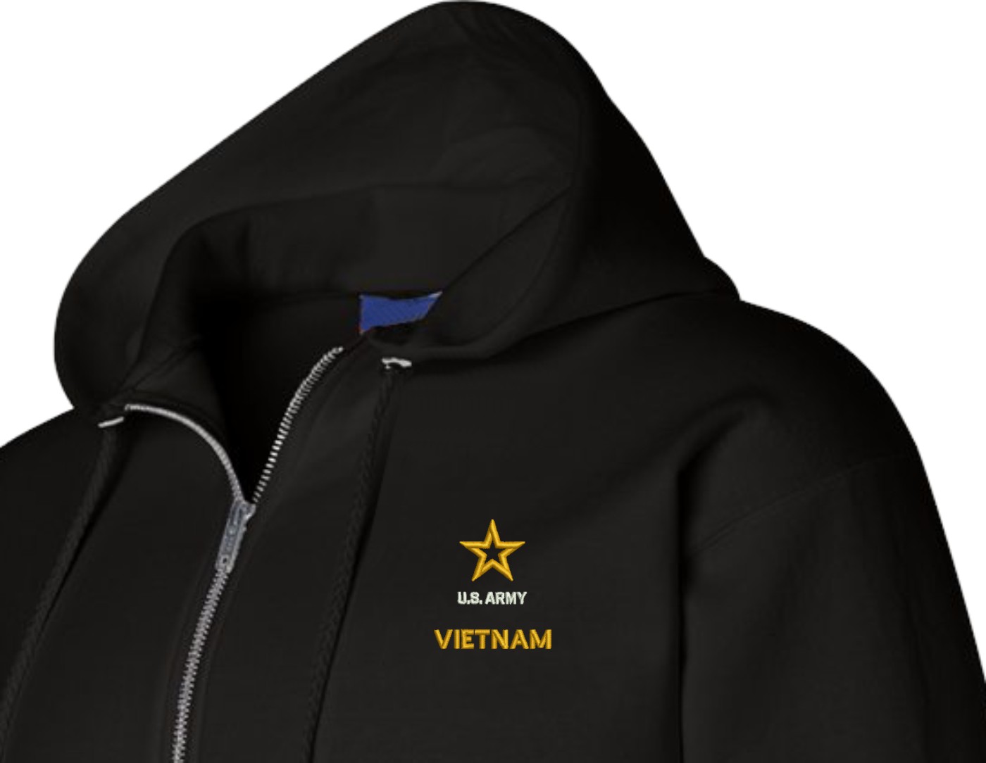 MilitaryBest has expanded its line of apparel with this custom embroidered U.S. Army Vietnam Zippered Hoodie. Each Hoodie is direct embroidered onto a Champion brand 9.5 oz 50/50 Cotton Poly blend. This U.S. Army Vietnam Zippered Hoodie will make an excellent addition to your wardrobe, or a great gift. Your satisfaction is Guaranteed! This U.S. Army Vietnam Zippered Hoodie is custom embroidered at our facilities in Scottsboro, AL.