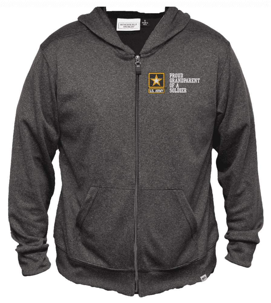 MilitaryBest proudly offers this top-quality Proud GrandParent of a Soldier U.S. Army Star Men's 100% Polyester Heather Grey Full-Zip Hoodie. We have proudly partnered with Authentically American to offer you this Made in the USA Hoodie. Water & wrinkle resistance make this zip hoodie the perfect layering piece from the golf course to you favorite travel destination.As with all MilitaryBest items, our designs are Officially Licensed. A percentage of the sale of each MilitaryBest item is forwarded to the licensing department in support of it's MWR (Morale, Welfare, & Recreation) program. These payments are made by either ALL4U LLC or the wholesaler from where the item originated. Our team thanks you for your service and your support of these programs.