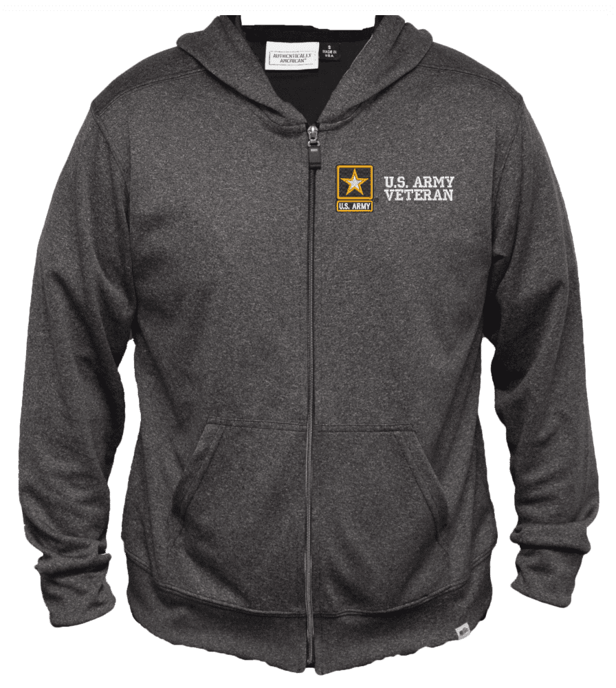 MilitaryBest proudly offers this top-quality U.S. Army Star Veteran Men's 100% Polyester Heather Grey Full-Zip Hoodie. We have proudly partnered with Authentically American to offer you this Made in the USA Hoodie. Water & wrinkle resistance make this zip hoodie the perfect layering piece from the golf course to you favorite travel destination.