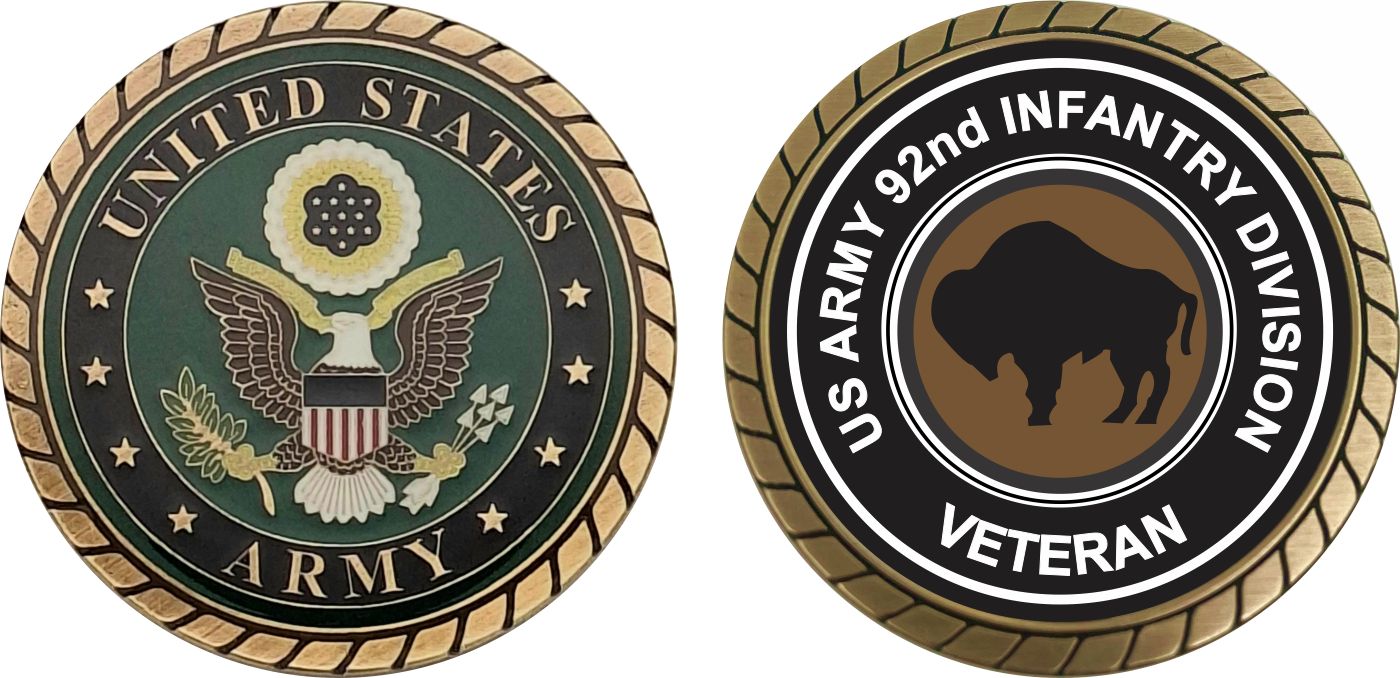 This 1 3/4” U.S. Army Veteran 92ND INFANTRY DIVISION Challenge Coin is proudly offered by Militarybest. This Officially Licensed Army coin has beautiful enamel finish on one side and an organized crisp clean 92ND INFANTRY DIVISION design on the opposite side.