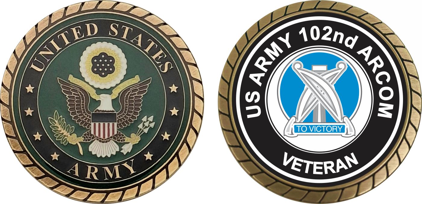 This 1 3/4” U.S. Army Veteran 102nd ARCOM Unit Crest Challenge Coin is proudly offered by Militarybest. This Officially Licensed Army coin has beautiful enamel finish on one side and an organized crisp clean 102nd ARCOM Unit Crest design on the opposite side.