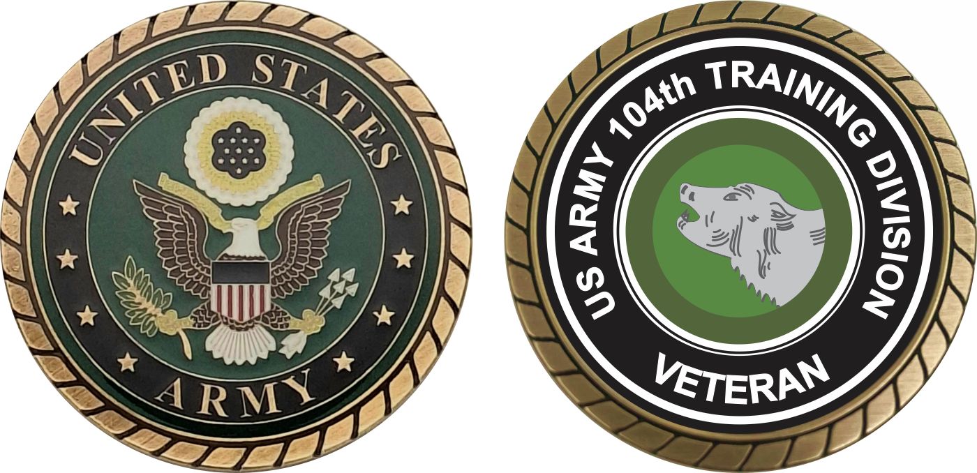 This 1 3/4” U.S. Army Veteran 104th Training Division Challenge Coin is proudly offered by Militarybest. This Officially Licensed Army coin has beautiful enamel finish on one side and an organized crisp clean 104th Training Division design on the opposite side.