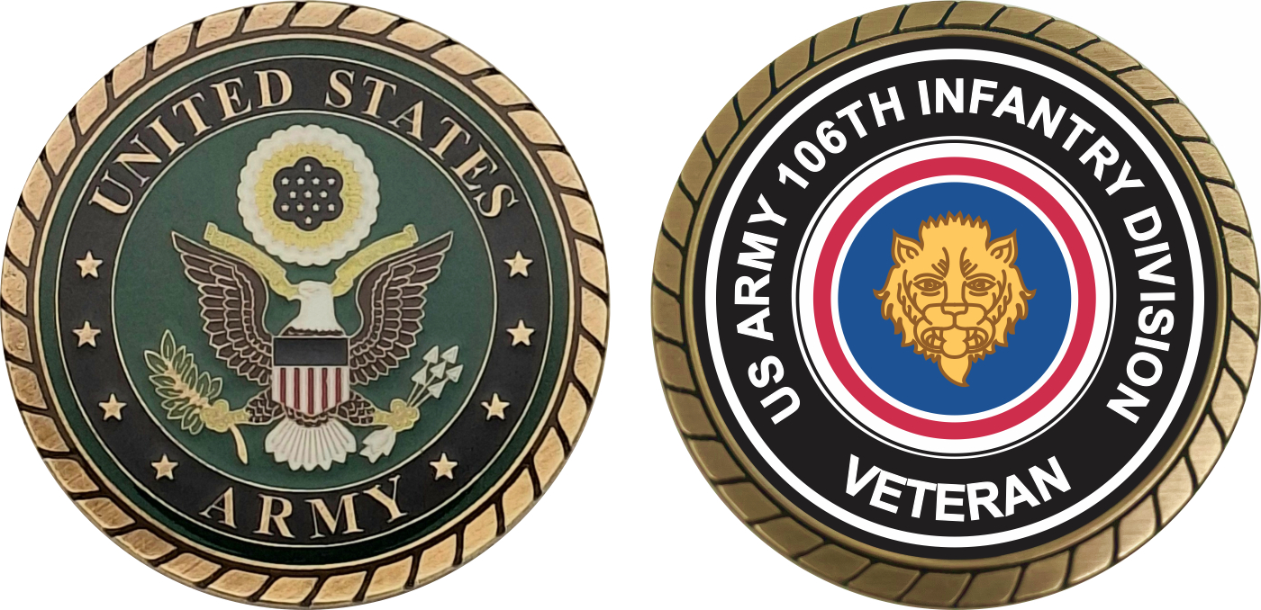 This 1 3/4” U.S. Army Veteran 106th Infantry Challenge Coin is proudly offered by Militarybest. This Officially Licensed Army coin has beautiful enamel finish on one side and an organized crisp clean 106th Infantry design on the opposite side.