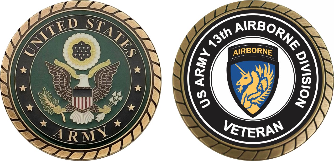 This 1 3/4” U.S. Army Veteran 13th Ariborne Division Challenge Coin is proudly offered by Militarybest. This Officially Licensed Army coin has beautiful enamel finish on one side and an organized crisp clean 13th Ariborne Division design on the opposite side.