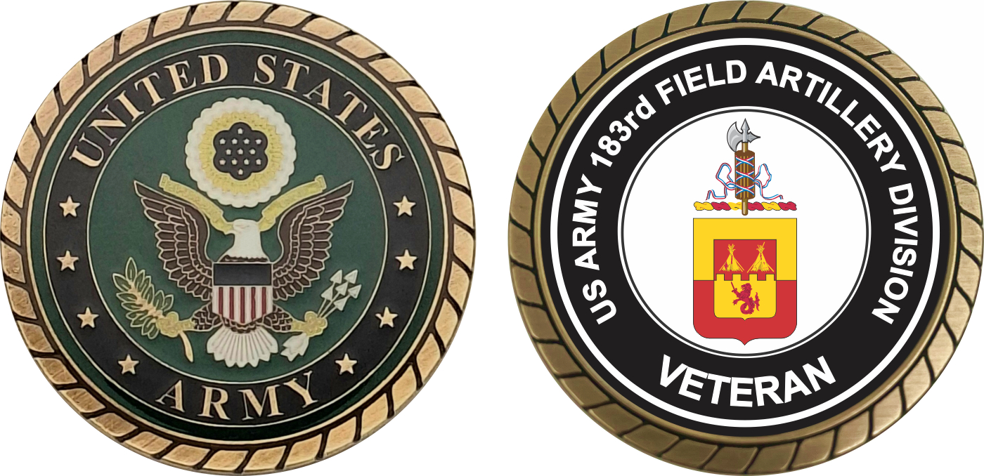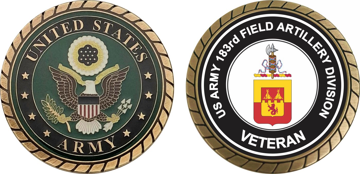 This 1 3/4” U.S. Army Veteran 183rd Field Artillery Division Challenge Coin is proudly offered by Militarybest. This Officially Licensed Army coin has beautiful enamel finish on one side and an organized crisp clean 183rd Field Artillery Division design on the opposite side.