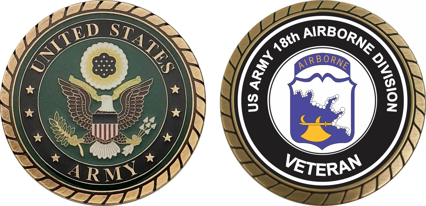 This 1 3/4” U.S. Army Veteran 18th Airborne Division Challenge Coin is proudly offered by Militarybest. This Officially Licensed Army coin has beautiful enamel finish on one side and an organized crisp clean 18th Airborne Division design on the opposite side.