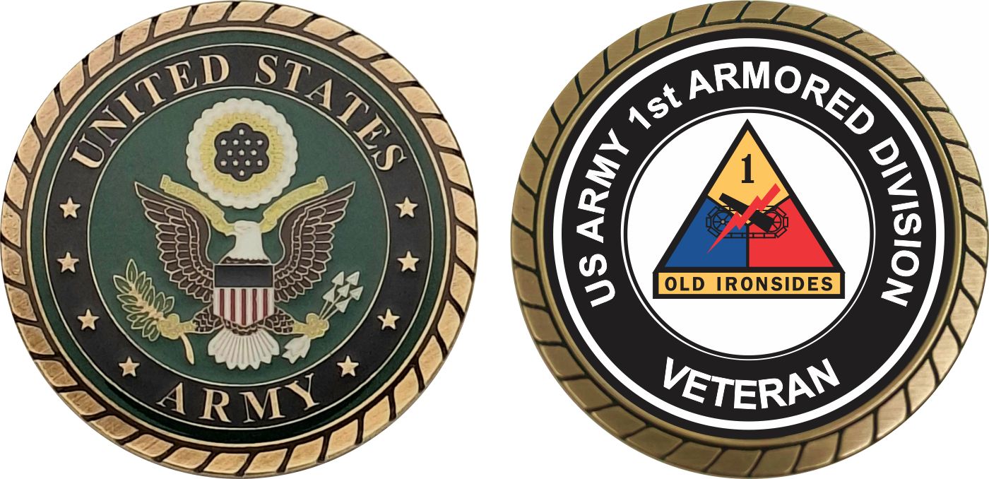 This 1 3/4” U.S. Army Veteran 1st Armored Division Challenge Coin is proudly offered by Militarybest. This Officially Licensed Army coin has beautiful enamel finish on one side and an organized crisp clean 1st Armored Division design on the opposite side.