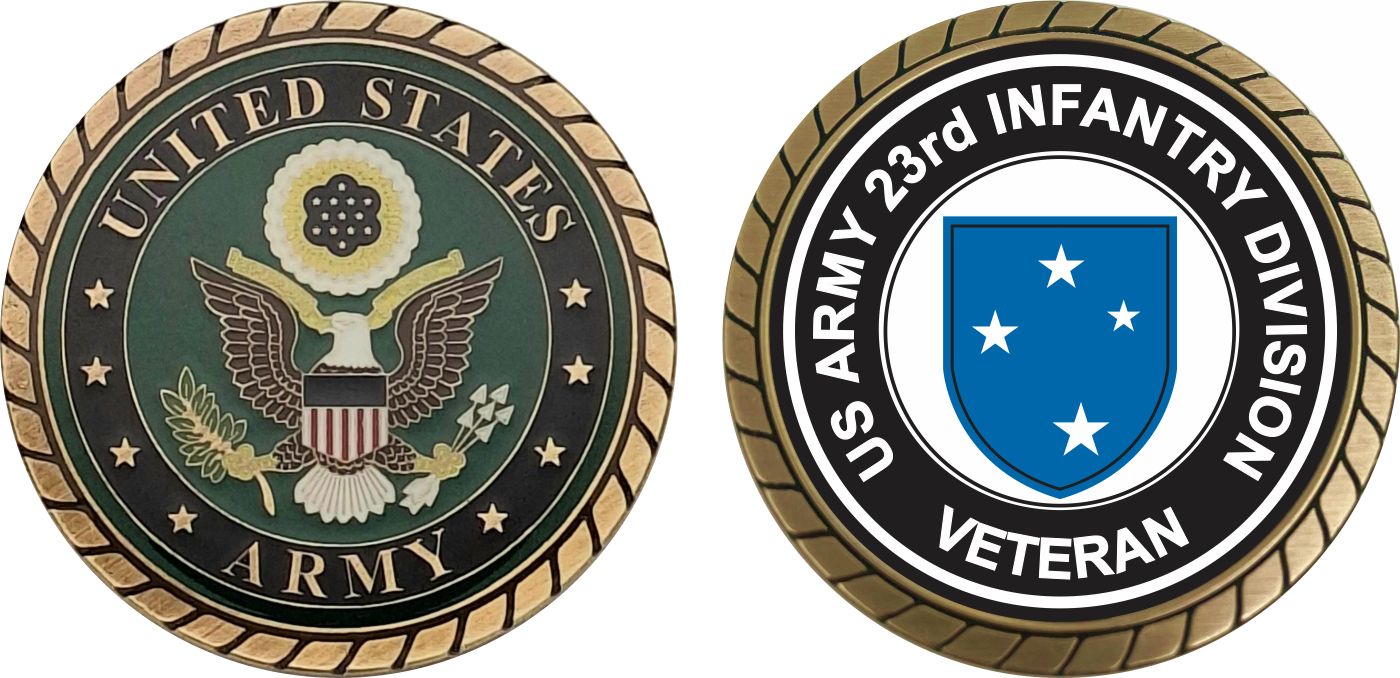 This 1 3/4” U.S. Army Veteran 23rd Infantry Division Challenge Coin is proudly offered by Militarybest. This Officially Licensed Army coin has beautiful enamel finish on one side and an organized crisp clean 23rd Infantry Division design on the opposite side.