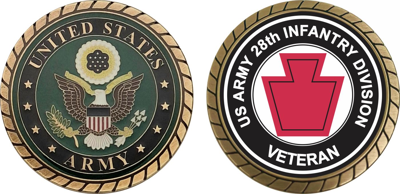 This 1 3/4” U.S. Army Veteran 28th Infantry Division Challenge Coin is proudly offered by Militarybest. This Officially Licensed Army coin has beautiful enamel finish on one side and an organized crisp clean 28th Infantry Division design on the opposite side.