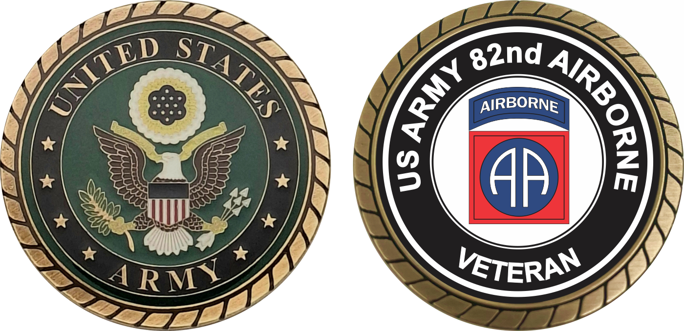 This 1 3/4” U.S. Army Veteran 82nd Airborne Challenge Coin is proudly offered by Militarybest. This Officially Licensed Army coin has beautiful enamel finish on one side and an organized crisp clean 82nd Airborne design on the opposite side.