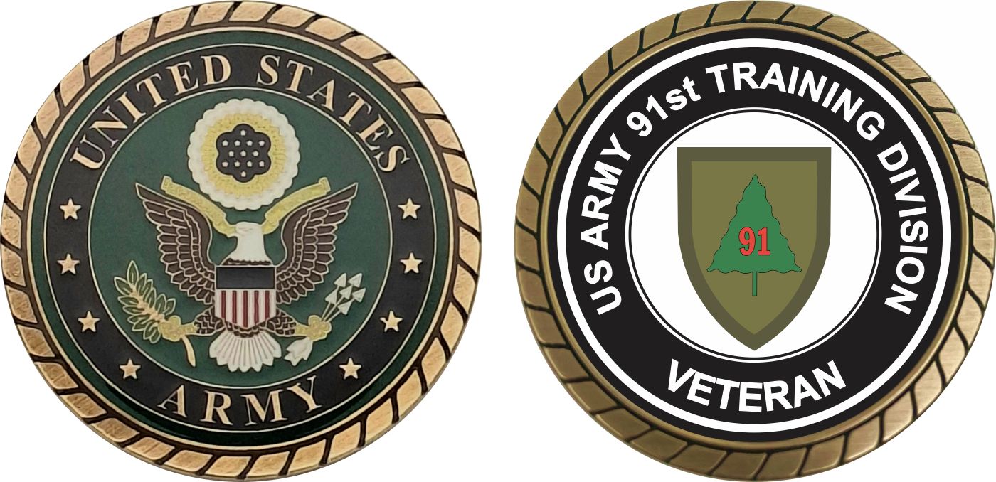 This 1 3/4” U.S. Army Veteran 91ST TRAINING DIVISION Challenge Coin is proudly offered by Militarybest. This Officially Licensed Army coin has beautiful enamel finish on one side and an organized crisp clean 91ST TRAINING DIVISION design on the opposite side.