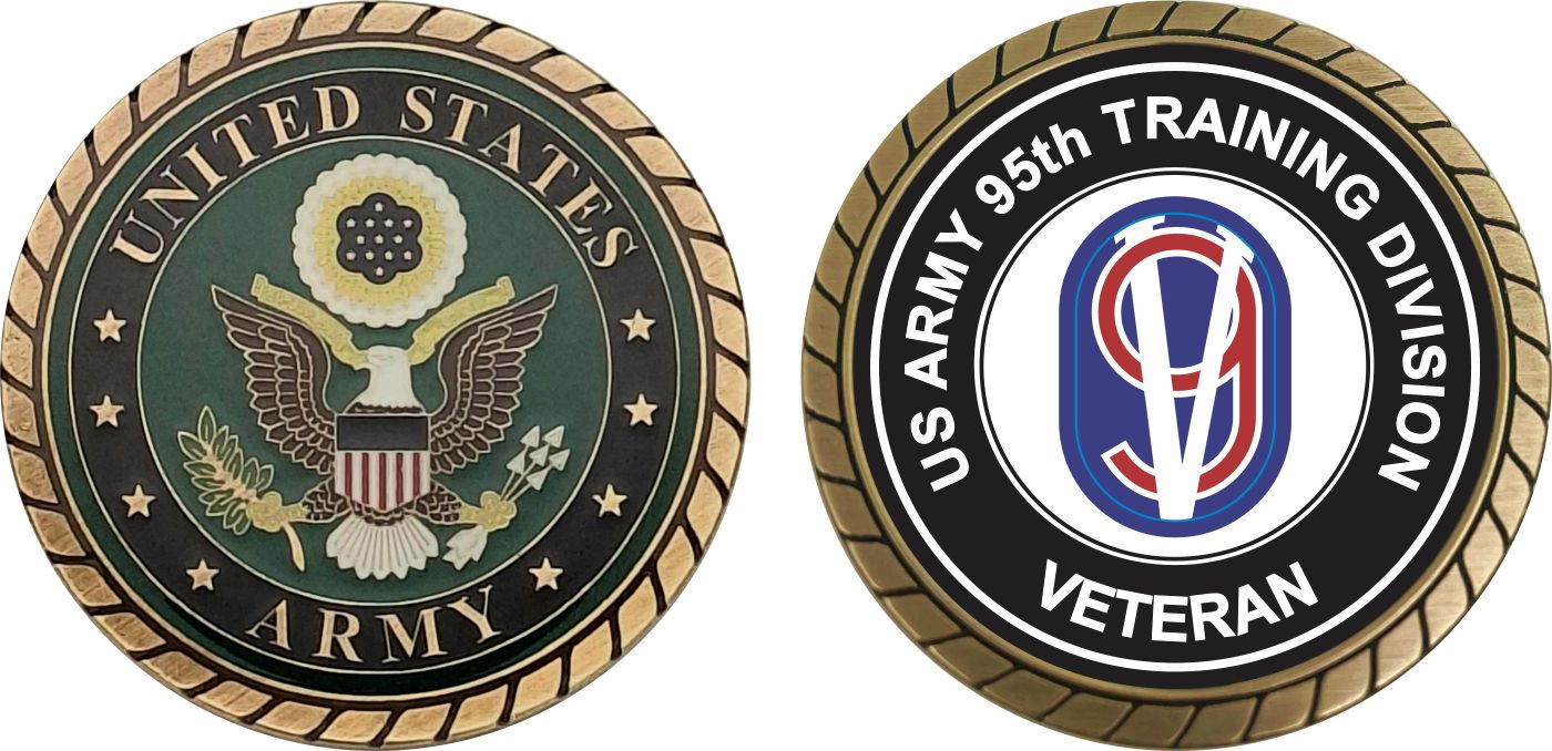 This 1 3/4” U.S. Army Veteran 95TH TRAINING DIVISION Challenge Coin is proudly offered by Militarybest. This Officially Licensed Army coin has beautiful enamel finish on one side and an organized crisp clean 95TH TRAINING DIVISION design on the opposite side.