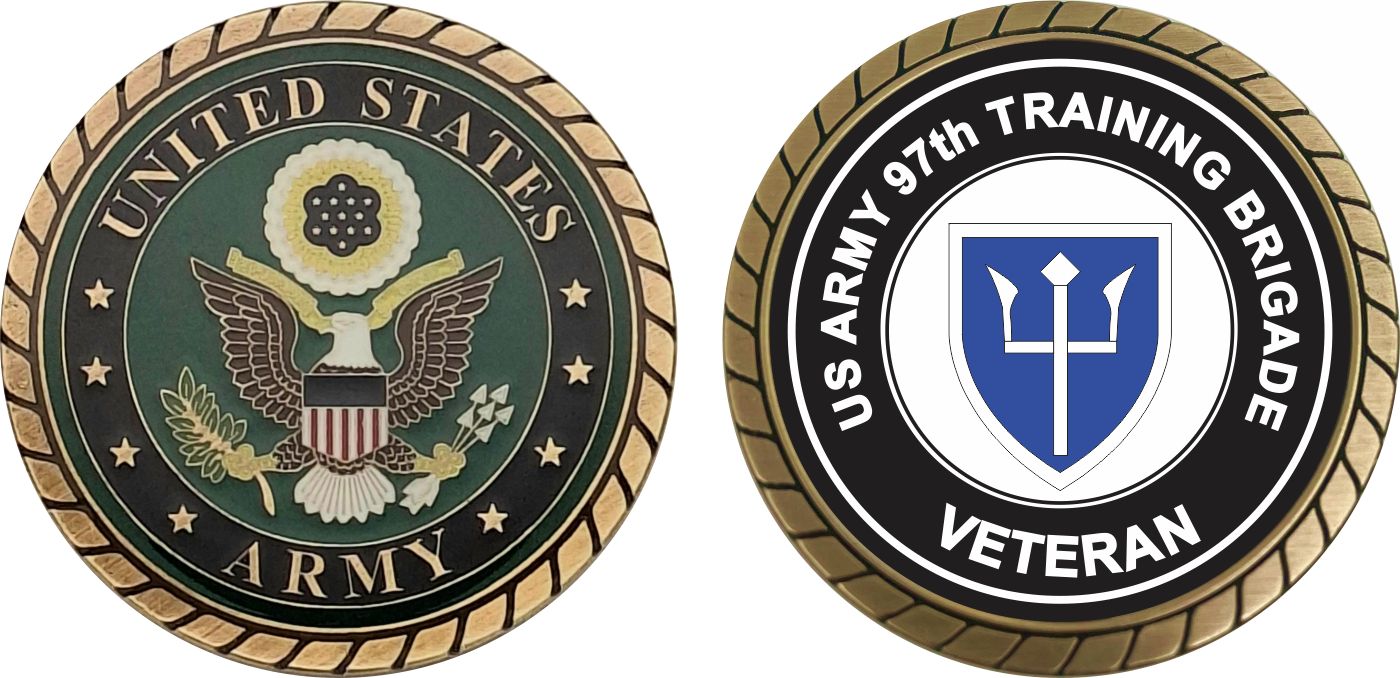 This 1 3/4” U.S. Army Veteran 97th Training Brigade Challenge Coin is proudly offered by Militarybest. This Officially Licensed Army coin has beautiful enamel finish on one side and an organized crisp clean 97th Training Brigade design on the opposite side.