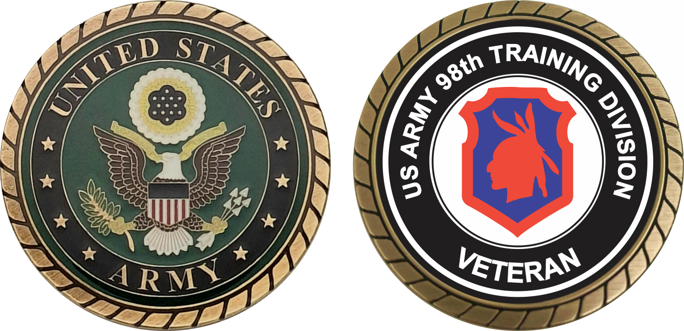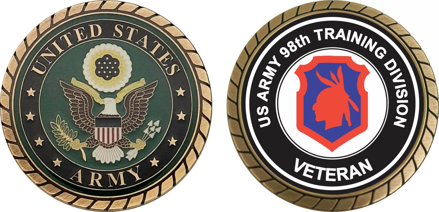 This 1 3/4” U.S. Army Veteran 98th Training Division Challenge Coin is proudly offered by Militarybest. This Officially Licensed Army coin has beautiful enamel finish on one side and an organized crisp clean 98th Training Division design on the opposite side.