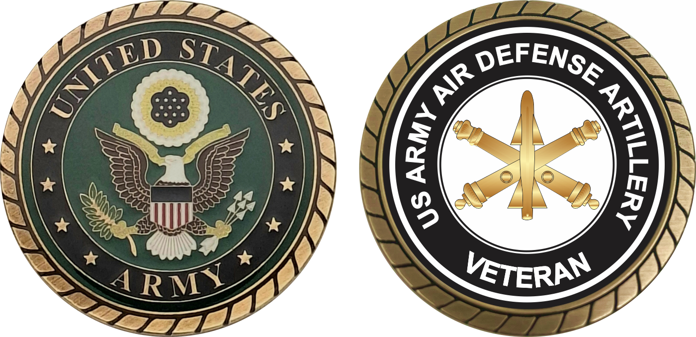 This 1 3/4” U.S. Army Veteran Air Defense Artillery Challenge Coin is proudly offered by MilitaryBest. This Officially Licensed Army coin has beautiful enamel finish on one side and an organized crisp clean U.S. Army Veteran Air Defense Artillery design on the opposite side.